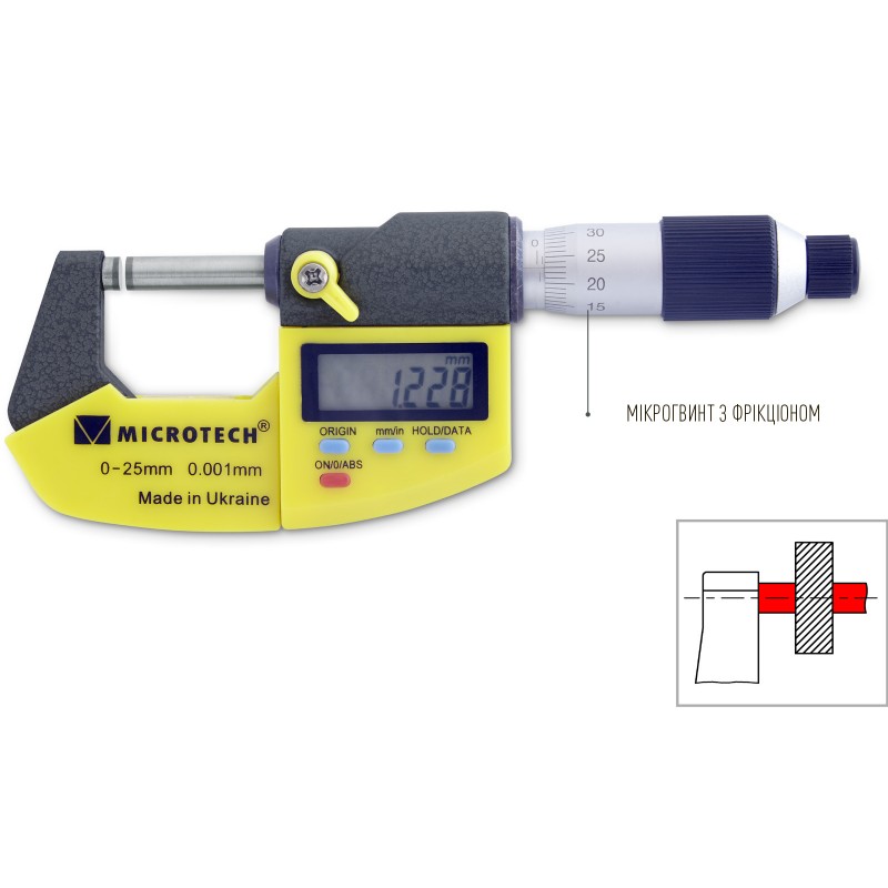Digital micrometers are equipped with a digital display and have a division value of 0.001 mm. Simple intuitive menu, easy to operate. The MCC micrometer has 4 control buttons: on / off, switching mm to inches and vice versa, as well as a button to hold the value displayed on the indicator. Digital micrometers are divided into accuracy classes (error) class 1 and class 2, class 1 has an error of plus minus 0.002 mm, class 2 has a measurement error of plus minus 0.004 mm. The digital micrometer is equipped with an additional vernier measurement scale, which has a division value of 0.01 mm. Supplied in a plastic case, with a battery and a key to adjust the zero in case of knocking it down. According to the degree of protection, digital micrometers are divided into two IP65 and IP54 , class IP65, according to the classification of degrees of protection IP65 guarantees complete protection against dust ingress into the device, class IP54 implies the penetration of dust and is designed to work in clean conditions and dust-free rooms. The advantages of digital micrometers are undeniable, high accuracy and minimum error solve all your measuring tasks