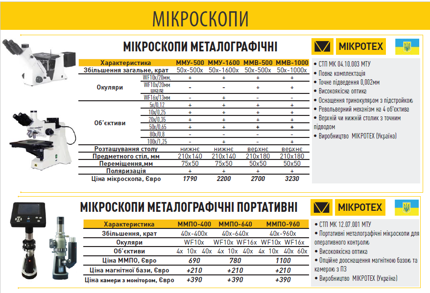 Ассортимент металлографических микроскопов  МИКРОТЕХ® представлен оптическими приборами, которые предназначены для наблюдения непрозрачных и полупрозрачных объектов. Металлографические микроскопы Микротех дают возможность использовать различные методы исследования: наблюдение и измерение интересующих объектов как в отраженном, так и в проходящем свете, в светлом поле и поляризованном свете.